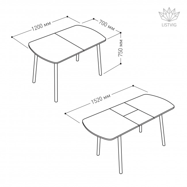 Размер стола (ДхШхВ): 1200 (1520)*700*750. Столешница - закаленное стекло, подстолье - ЛДСП, вкладной элемент закаленное стекло + ЛДСП в цвет основной столешницы, опоры металл покраска. Максимальная нагрузка 100 кг.