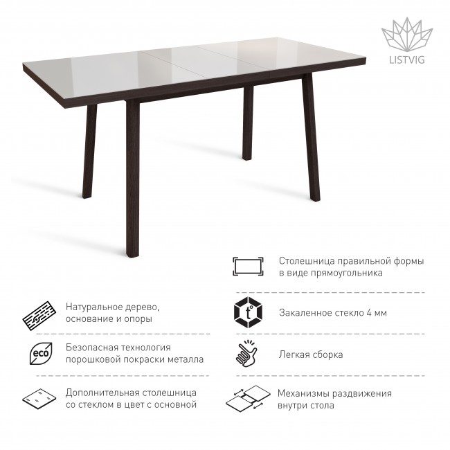 Размер стола (ДхШхВ): 1200 (1520)*700*750. Столешница - закаленное стекло, подстолье и опоры - массив березы покраска. Вкладной элемент закаленное стекло + ЛДСП в цвет основной столешницы. Максимальная нагрузка 100 кг.