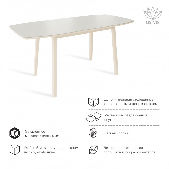 Размер стола (ДхШхВ): 1200 (1520)*700*750. Столешница - закаленное матовое стекло, подстолье - ЛДСП, вкладной элемент закаленное матовое стекло + ЛДСП в цвет основной столешницы, опоры металл покраска. Максимальная нагрузка 100 кг.