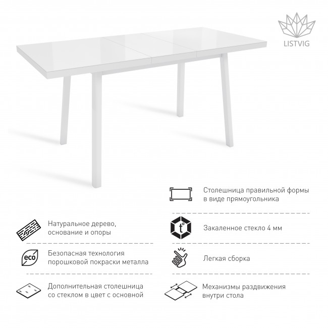 Размер стола (ДхШхВ): 1200 (1520)*700*750. Столешница - закаленное стекло, подстолье и опоры - массив березы покраска. Вкладной элемент закаленное стекло + ЛДСП в цвет основной столешницы. Максимальная нагрузка 100 кг.